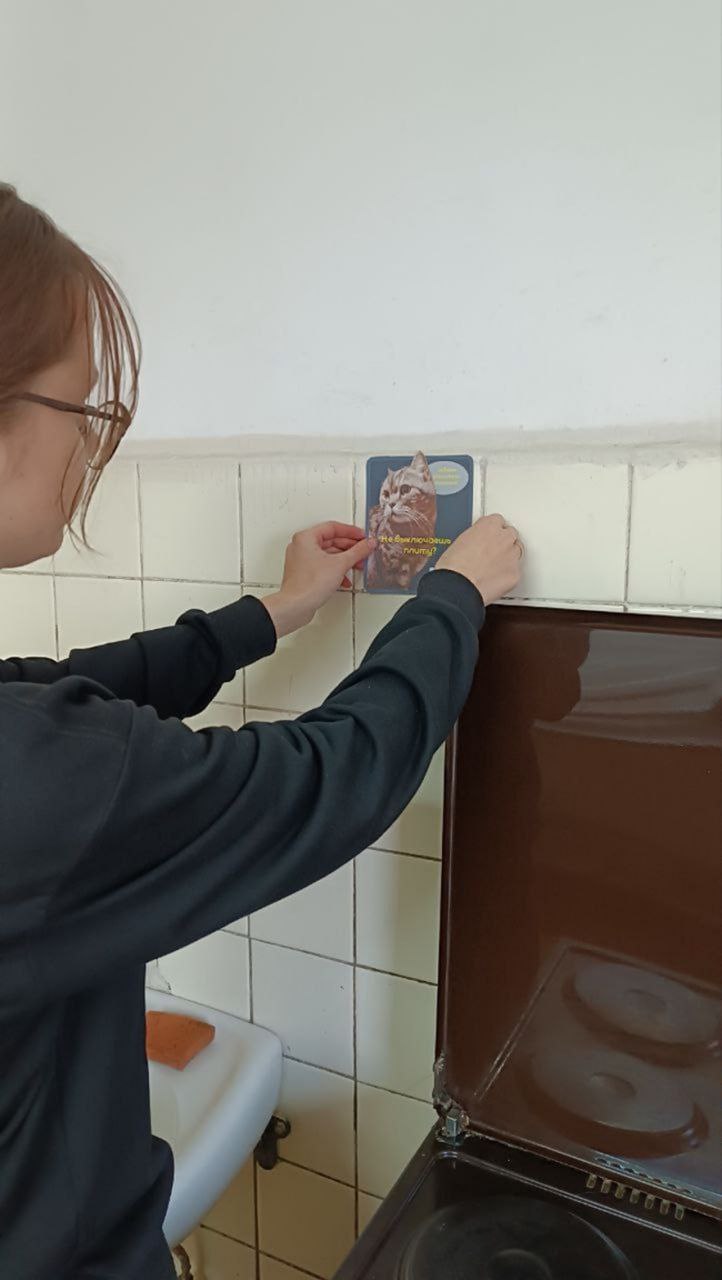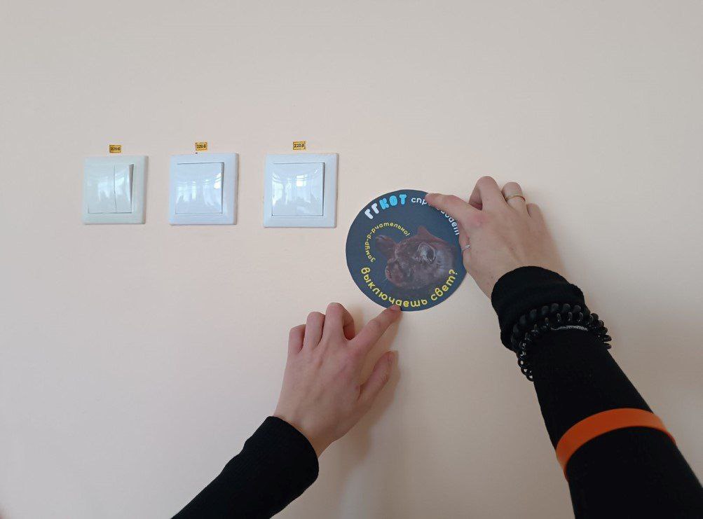 Первой площадкой для реализации инициативы стало общежитие колледжа. Именно там появились брендированные стикеры и таблички с котом Барсиком, который в дружелюбной форме напоминает учащимся о важности экономии света, воды и тепла.
